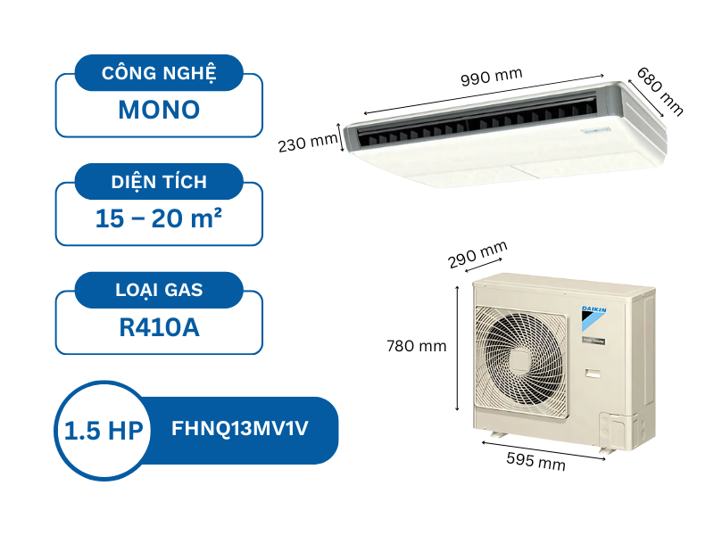Máy lạnh áp trần Daikin FHNQ13MV1V/RNQ13MV1V 1.5HP là lựa chọn lý tưởng cho các không gian nhỏ như văn phòng, cửa hàng, nhà hàng với diện tích dưới 20m². Thuộc dòng SkyAir của Daikin, model này nổi bật với thiết kế hiện đại, hiệu suất làm lạnh ổn định và độ bền cao. Phù hợp với hệ thống điện 1 pha (220V), máy dễ lắp đặt và vận hành. Bài viết phân tích chi tiết đặc điểm, tính năng, hiệu suất và lợi ích của sản phẩm.