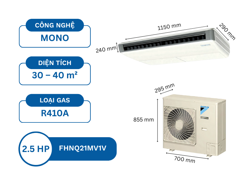 Máy lạnh áp trần Daikin FHNQ21MV1V/RNQ21MV1V 2.5HP là lựa chọn tối ưu cho các không gian thương mại và gia đình như văn phòng, showroom, nhà hàng với diện tích 30-45m². Thuộc dòng SkyAir của Daikin, model này nổi bật với thiết kế hiện đại, hiệu suất làm lạnh mạnh mẽ và độ bền cao. Phù hợp với hệ thống điện 1 pha (220V), máy đảm bảo vận hành ổn định và dễ lắp đặt. Bài viết phân tích chi tiết đặc điểm, tính năng, hiệu suất và lợi ích của sản phẩm.