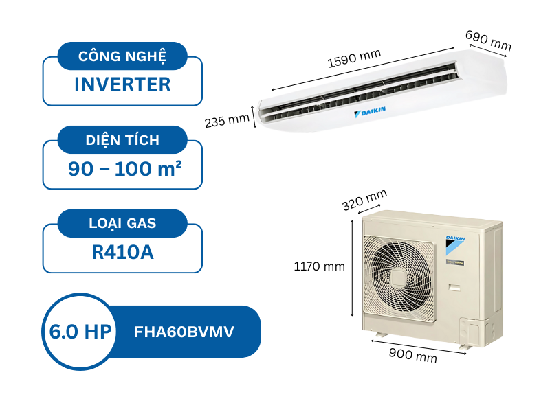 Máy lạnh áp trần Daikin Inverter FHA60BVMV 6HP là lựa chọn lý tưởng cho không gian thương mại như văn phòng, showroom, nhà hàng diện tích 80-120m². Thuộc dòng SkyAir cao cấp, model này nổi bật với công nghệ Inverter tiết kiệm điện, thiết kế hiện đại, hiệu suất làm lạnh mạnh mẽ và độ bền cao. Phù hợp hệ thống điện dân dụng hoặc công nghiệp, dễ lắp đặt. Bài viết phân tích chi tiết đặc điểm, tính năng, hiệu suất và lợi ích của sản phẩm.